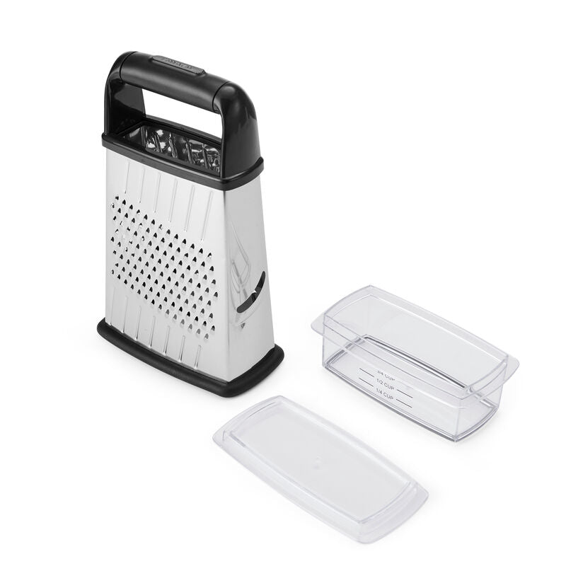 Meet the Farberware Professional Slim Box Grater, your new secret weapon for hassle-free food prep that eliminates the usual mess of shredded cheese everywhere and the need for multiple tools. Whether you're prepping taco night toppings, measuring precise amounts of Parmesan for your signature pasta, or batch-grating vegetables for meal prep Sunday, this 4-in-1 grater with its integrated measuring cup handles it all with ease. The clear 1-cup catch container with measurement marks and storage lid means you can grate, measure, and store your ingredients in one seamless motion, while the non-slip base and comfortable grip handle ensure stability and control. Built to last with durable stainless steel blades and dishwasher-safe components, this grater brings professional-grade efficiency to your everyday cooking routine.